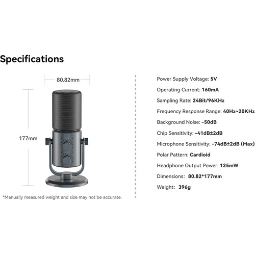 Immerse your audience in crystal-clear sound with the Ulanzi DCM‑05 USB Condenser Microphone—a pro-grade, latency-free broadcasting tool built for podcasting, streaming, gaming, and remote work. Its cardioid polar pattern captures your voice with precision while suppressing background noise. Control your sound with adjustable gain, real‑time equalizer, and a low-cut filter to eliminate plosives. A built-in mute button with RGB breathing effect signals your on-air status. Monitor live with zero delay via the 3.5 mm headphone jack and control volume intuitively. The package includes a sturdy adjustable desk stand, USB‑C and USB‑A cables—powerful performance in a polished, desktop-ready design.Specifications